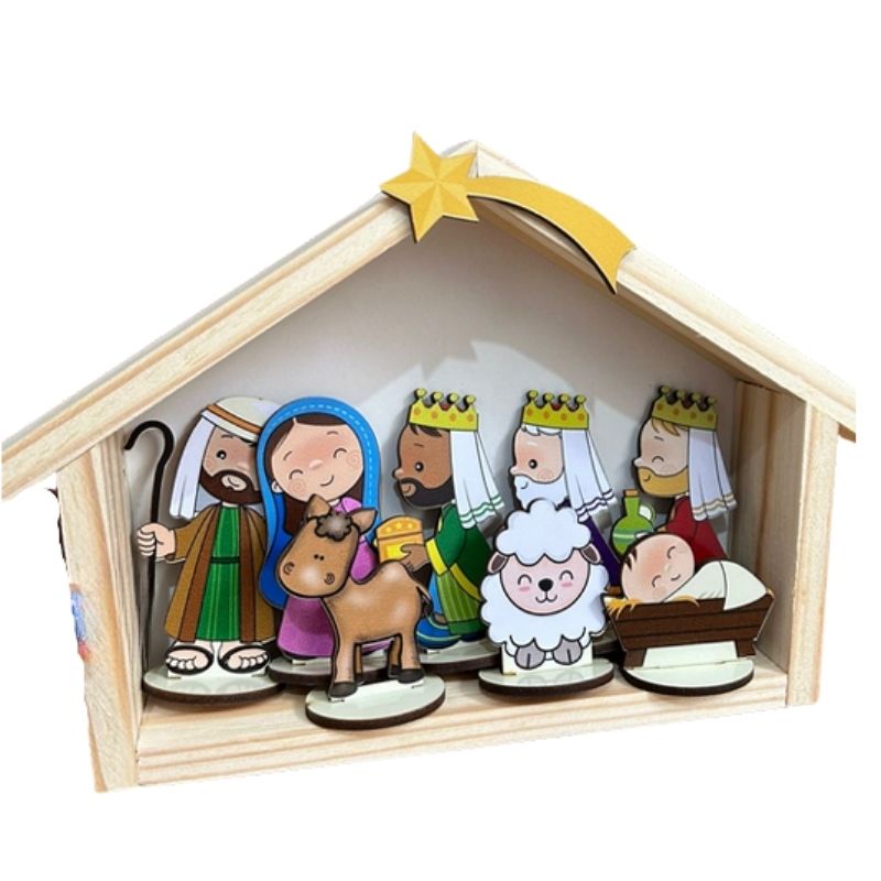 8 personagens e 1 casinha em madeira de pinus com estrela.