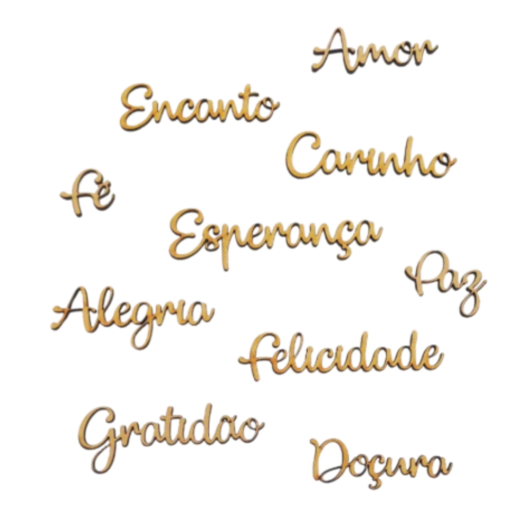 Kit com 10 palavras representando sentimentos positivos (Esperança, Felicidade, Doçura, Alegria, Carinho, Encanto, Paz, Fé, Amor, Gratidão